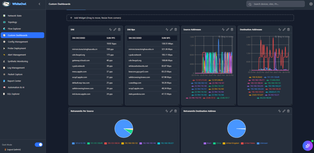 WhiteOwl Network observability platform: all-in-one platform collects Netflow, IPFIX, sFlow, VPC flow logs, SNMP, device logs, device configurations, synthetic data and makes it explorable and actionable in an easy to use user interface operating on top of the fastest backend available.